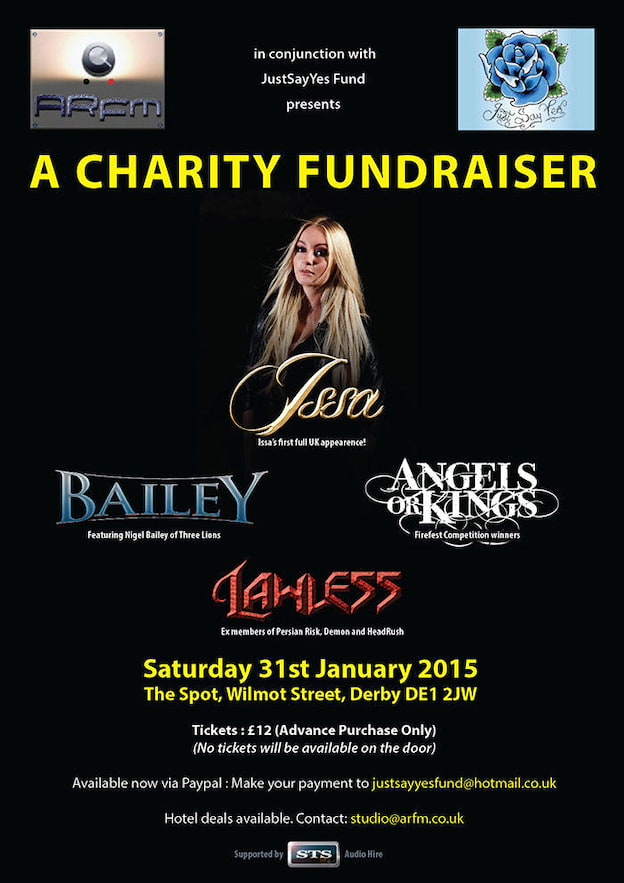 Headlining will be Frontiers Records artist ISSA, making her full UK debut, with support coming from 3 bands, Angels Or Kings, Bailey and Lawless. Tickets (which can only be purchased in advance) cost �12 and are available via Paypal from justsayyesfund@hotmail.co.uk